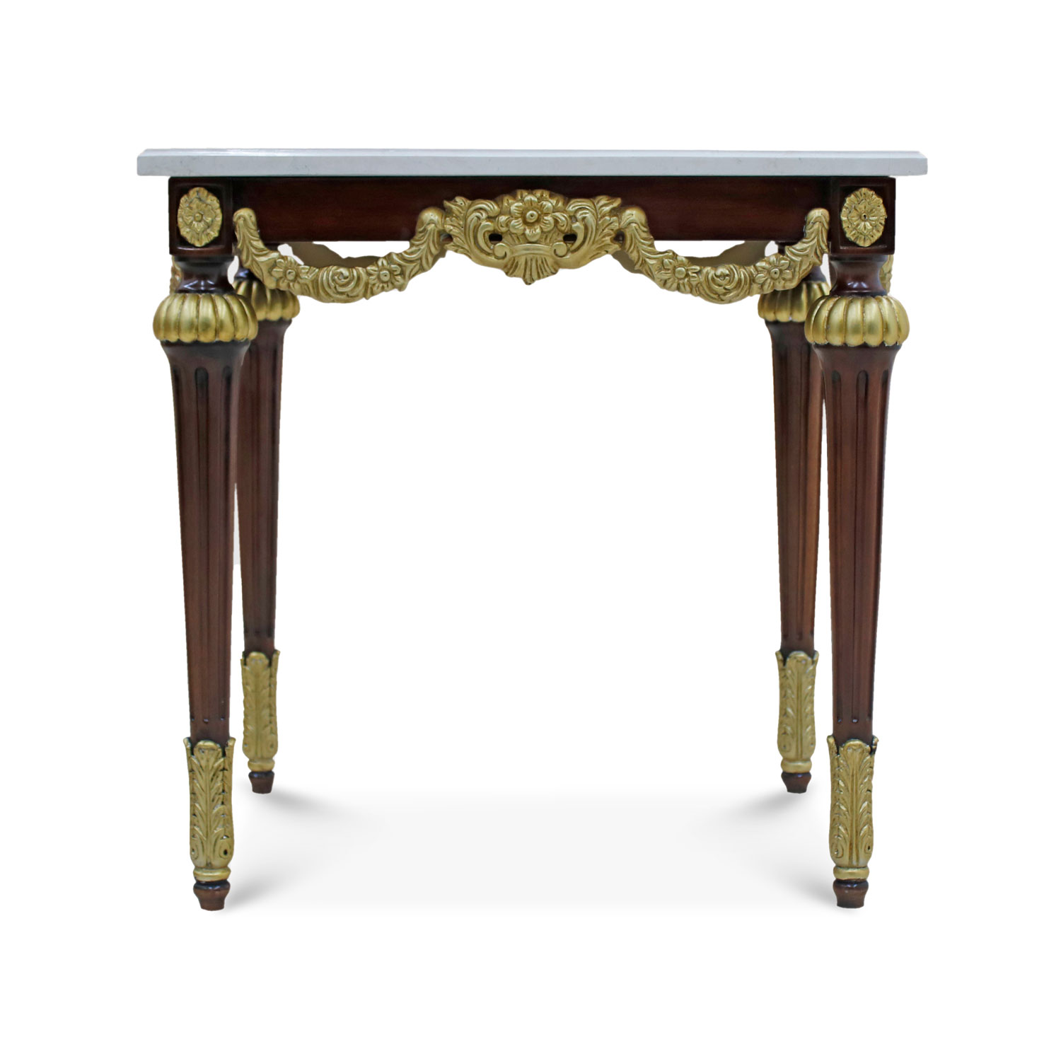 A blend of elegance and craftsmanship. Featuring a rich mahogany finish frame adorned with hand-carved in champagne-colored accents and a luxurious marble top.