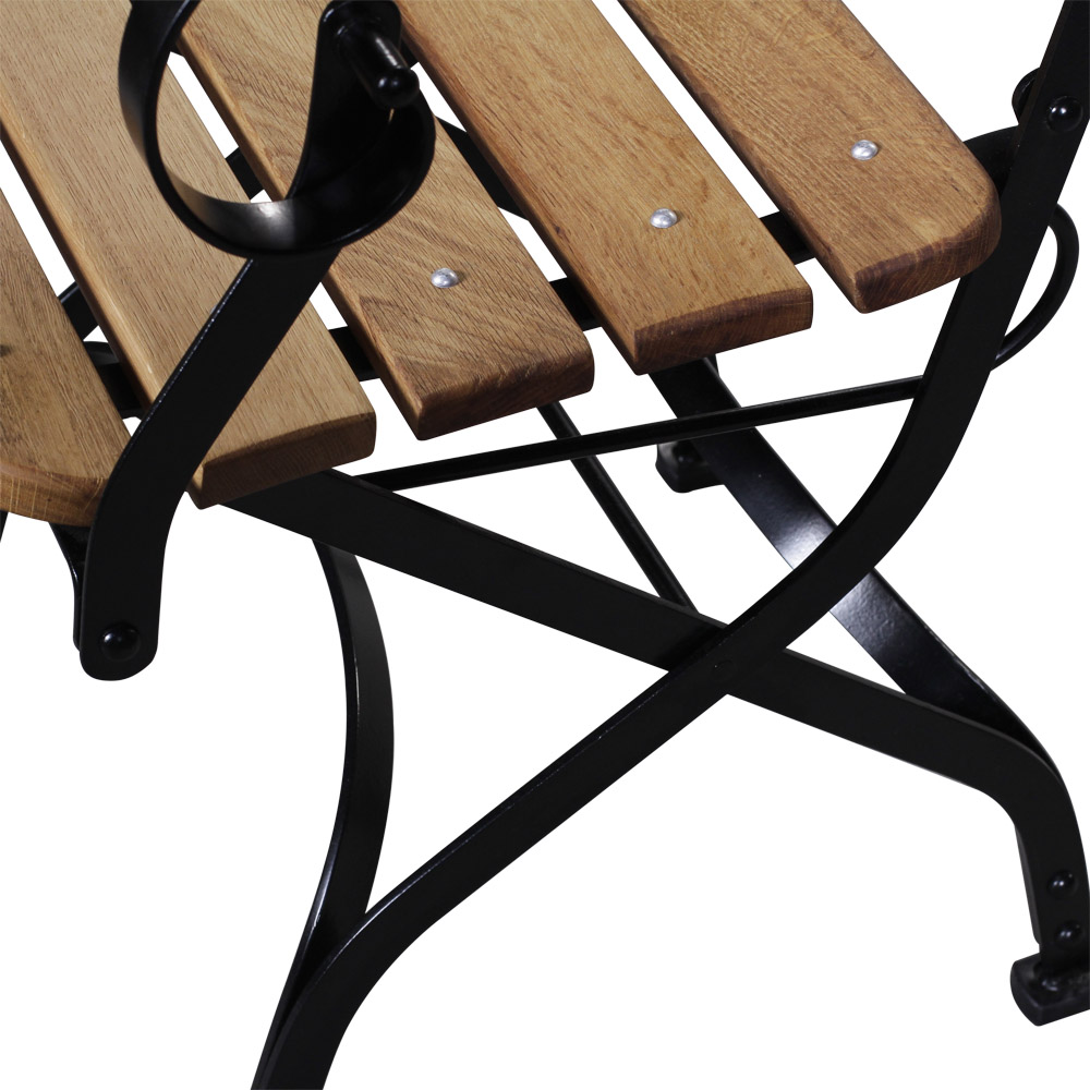 Foldable garden chair made from wrought iron and teak or oak wood. Shown here in black paint.