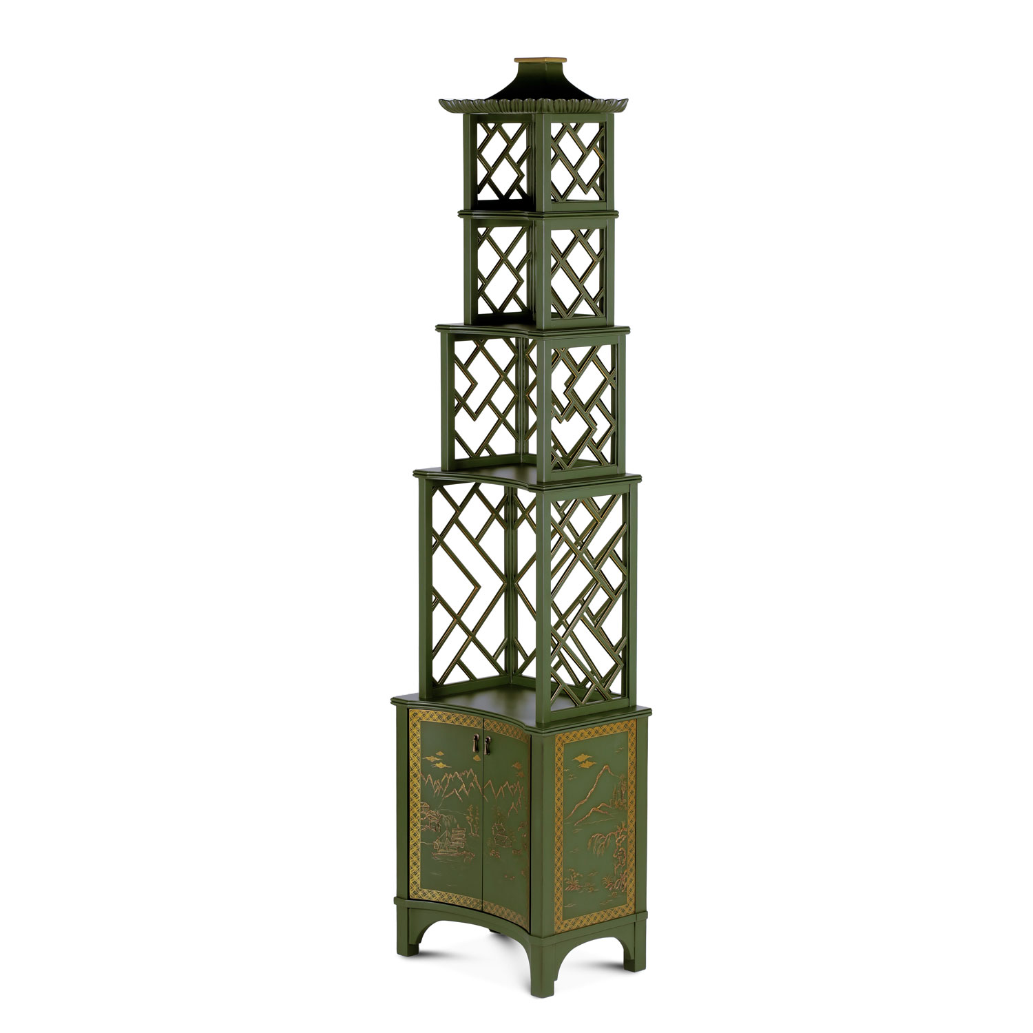 Interesting etagere in chinoiserie style shown here in chinoiserie green finish. The drawing on the doors of the cupboard represents farmers working the land. The doors have brass pulls. Looks great in bed or living room.