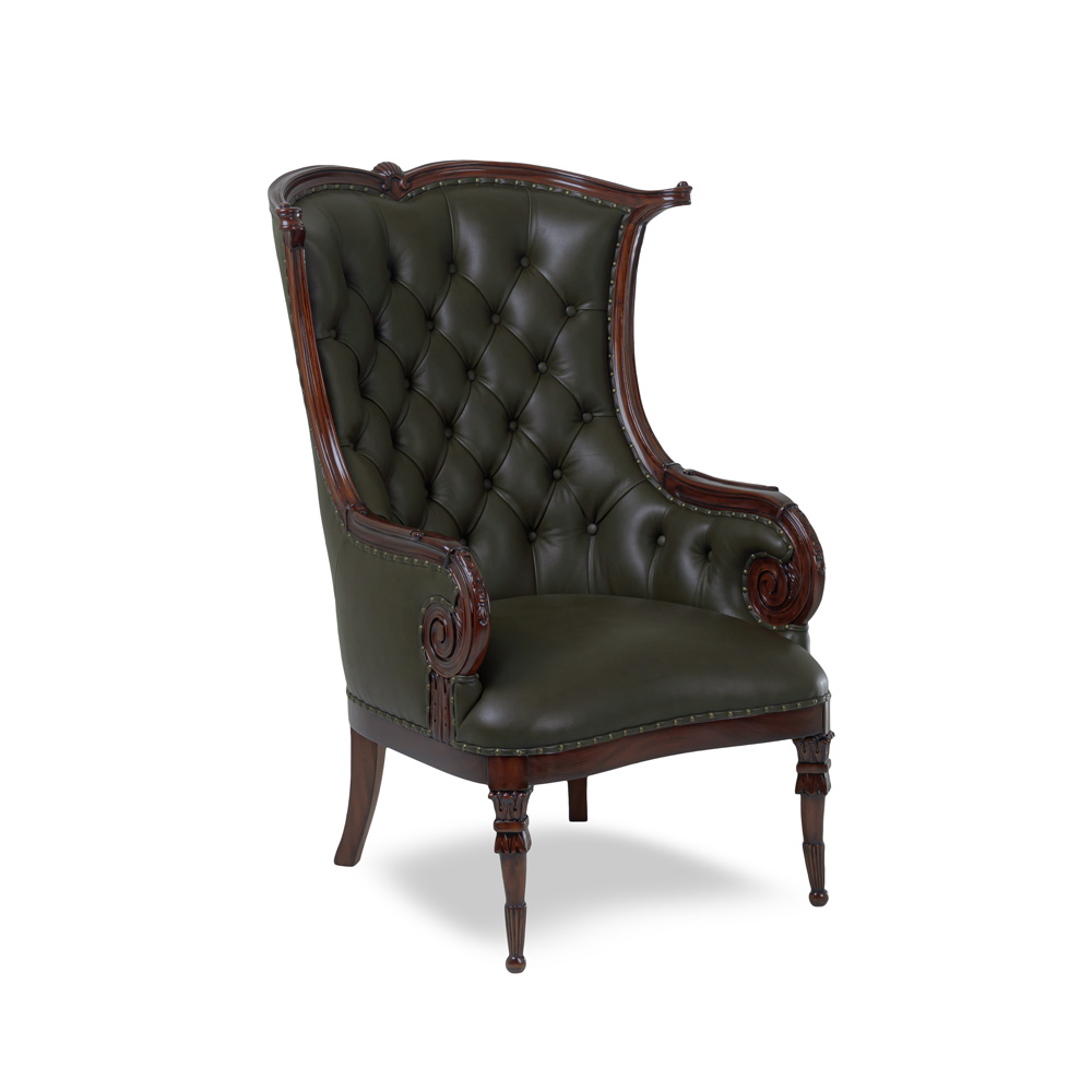 Classic fireside chair comes with carved frame and tufted backrest.