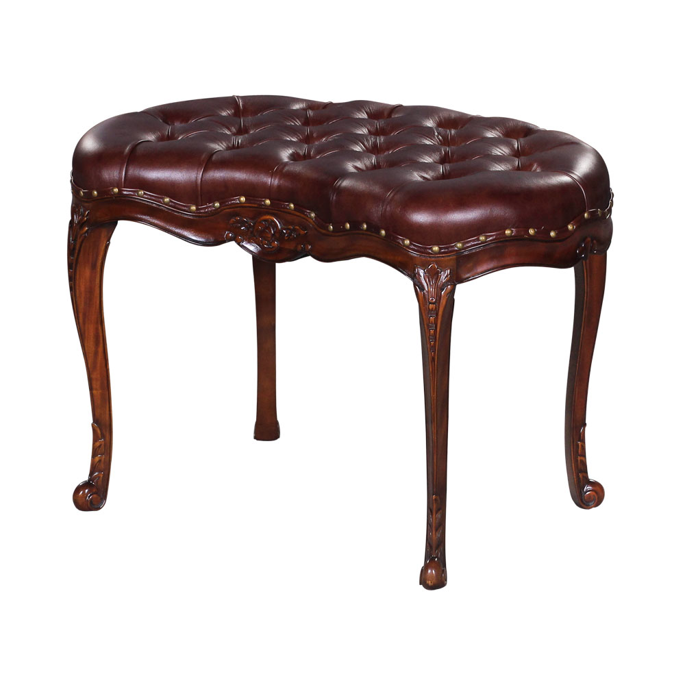 Beautiful french style stool with carved mahogany frame. Comes with thick tufted upholstery.