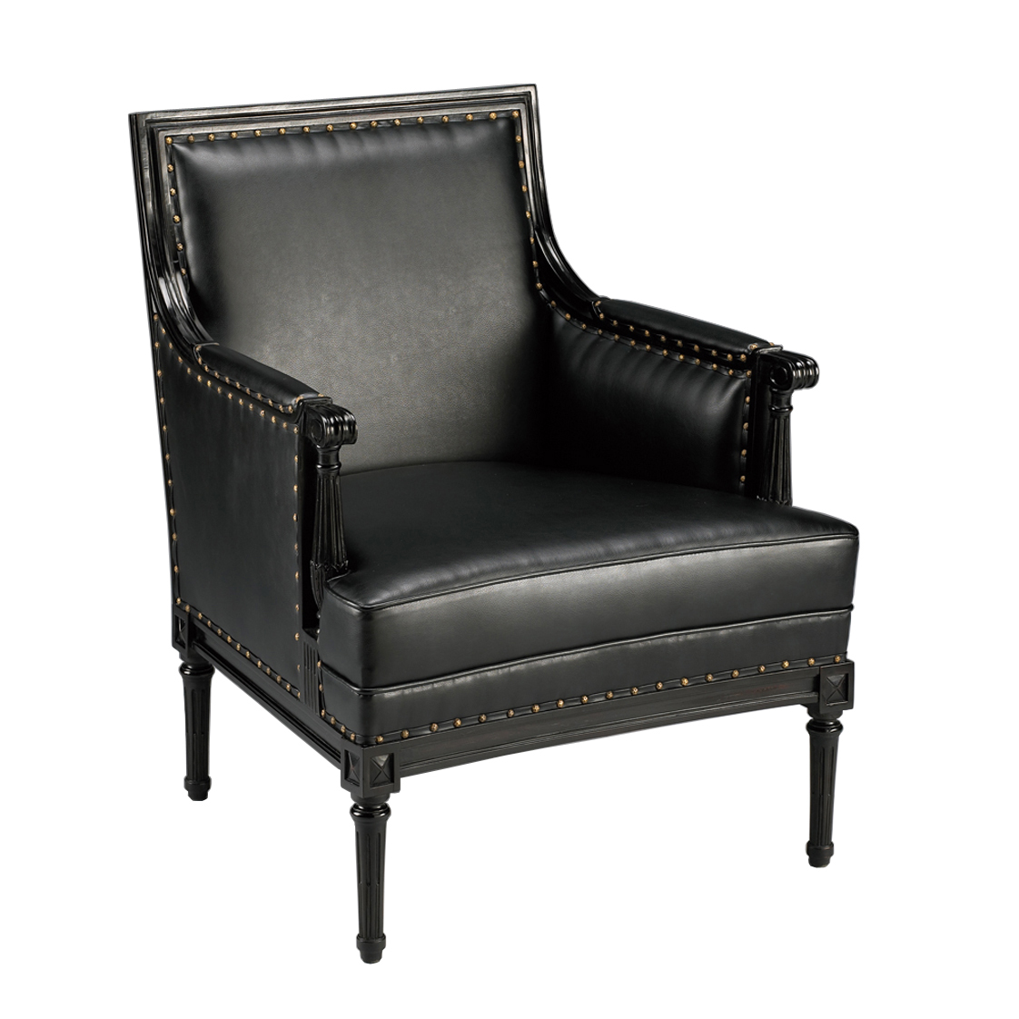 The luxurious arm chair, covered with leather upholstery. Carved arm pole and legs, with antique brass nails decoration.