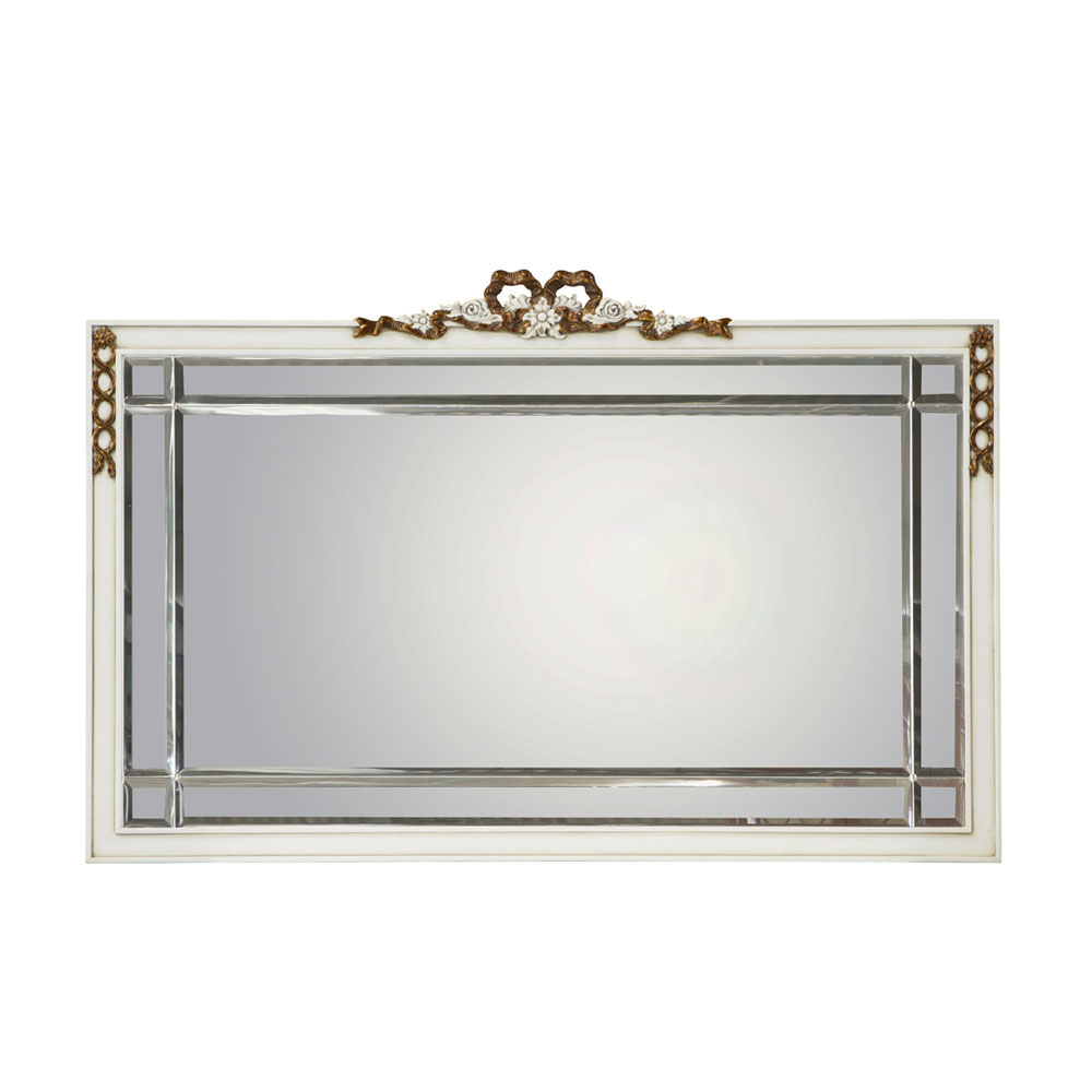 Elegant mirror with detailed rose and ribbon carvings and beveled, tiled glass. Shown in JWI finish and NF-11 accents.
