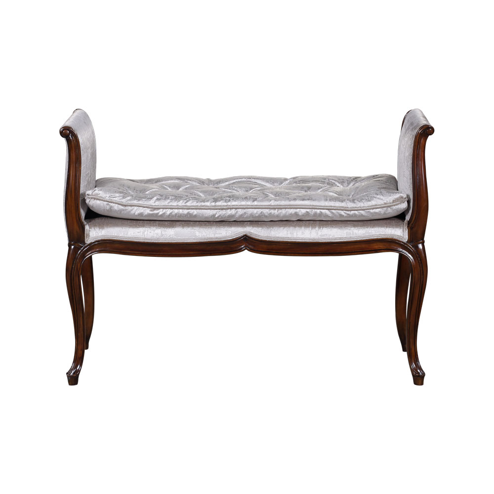 A beautiful classic bench. Made from solid mahogany with carving accent. Seating is upholstered with loose cushion.