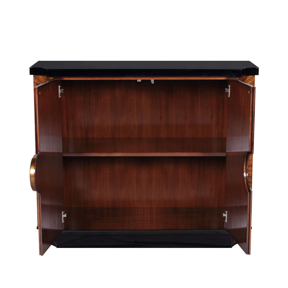 This cabinet comes with unique sunburst shaped doors made from exotic zebrano veneer. Decorated with concave sides and convex mirror at its center. It will be perfect for your modern room setting.